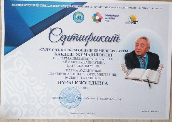Облыстық байқауШығыс Қазақстан облысы білім басқармасының дарындылық пен қосымша білім беруді дамытудың Шығыс Қазақстан ғылыми – әдістемелік «Дарын» орталығы 2022 жылдың 22-қыркүйегінде жалпы орта білім беретін мекемелердің 8-10 сынып оқушылары арасында жазушы Қабдеш Жұмаділовтің шығармашылығына арналған «Сұлу сөз, көркем ойдың кемеңгері» атты облыстық байқау өтті.