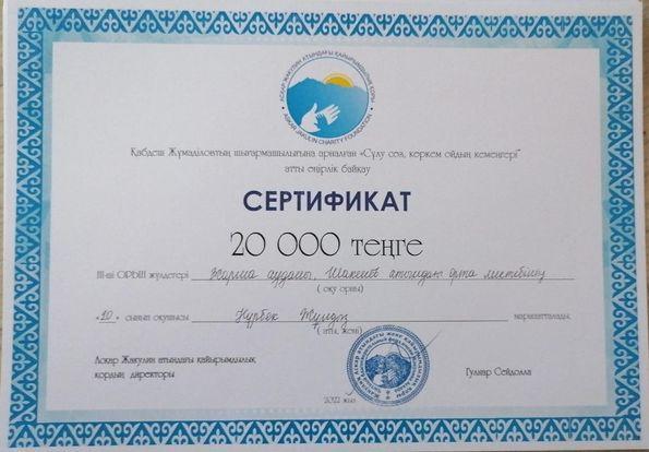 Нәтижесінде: ІІІ орын және 20000 теңгенің сертификаты, шығармасын жеңіп алды.